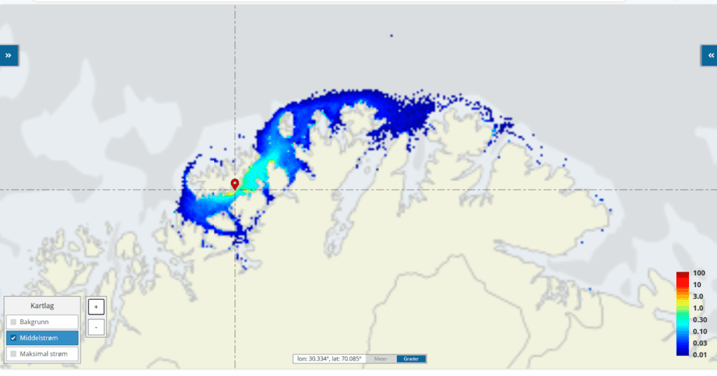 Giften fra et oppdrettsanlegg på østsiden av Magerøya brer seg inn i alle fjordene i Øst-Finnmark og helt inn i Varangerfjorden i løpet av 30 dager. Ett av bildene her viser hvordan oppløselige giftstoffer fra et annet anlegg på østsiden av Sørøya brer seg helt inn til Varangerfjorden. Slik fungerer havstrømmen opp langs norskekysten. Bildene her er fra bare tre anlegg.