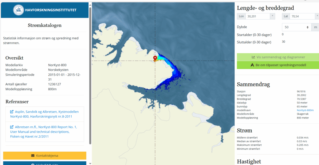 Spredningskartene vedlagt her er fra hentet fra Havforskningsinstituttets strøm- og spredningskatalog.