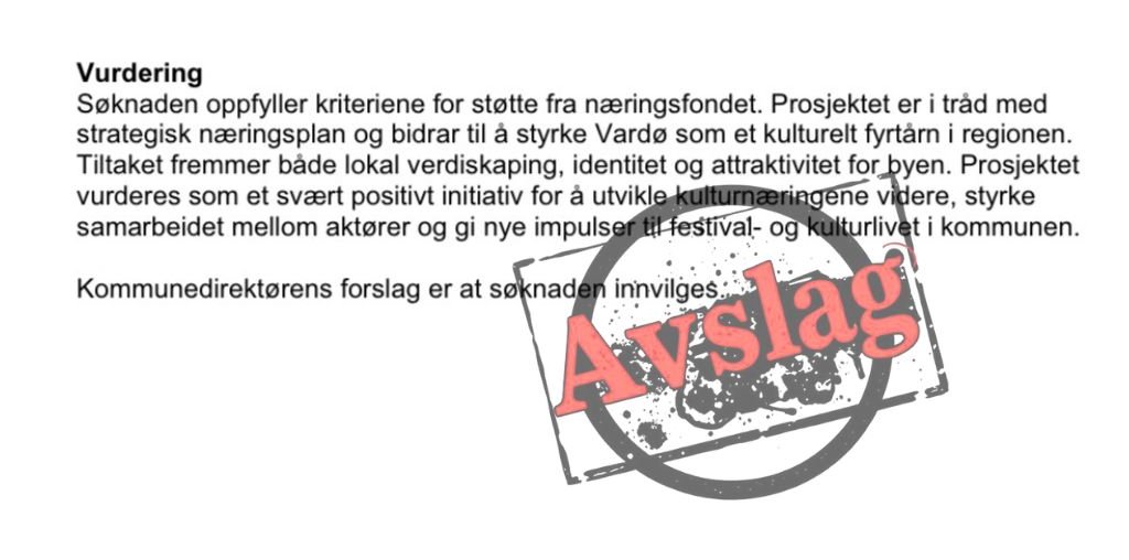 Jeg blir oppriktig, ja kanskje lei meg, men mest oppgitt! For jeg har en større forhåpning om at lokalpolitikerne først og fremst er oppdatert, og ikke minst behandler enhver sak som en unik sak, og ikke «sekkepose»-behandling og ser på to helt ulike søknader fra ulike aktører som like. Formålet til næringsfondet er å utvikle næringslivet, som bygger på strategisk næringsplan for Vardø, der plattformen er nettopp kulturbygging! I Vardø har kulturnæringen en unik rolle. Mange ser til Vardø med beundring og kanskje ærefrykt for hvordan samfunnet utvikler seg, på lag – med ulike næringer. Også innenfor kulturnæringsarbeidsplassene i kommunen.