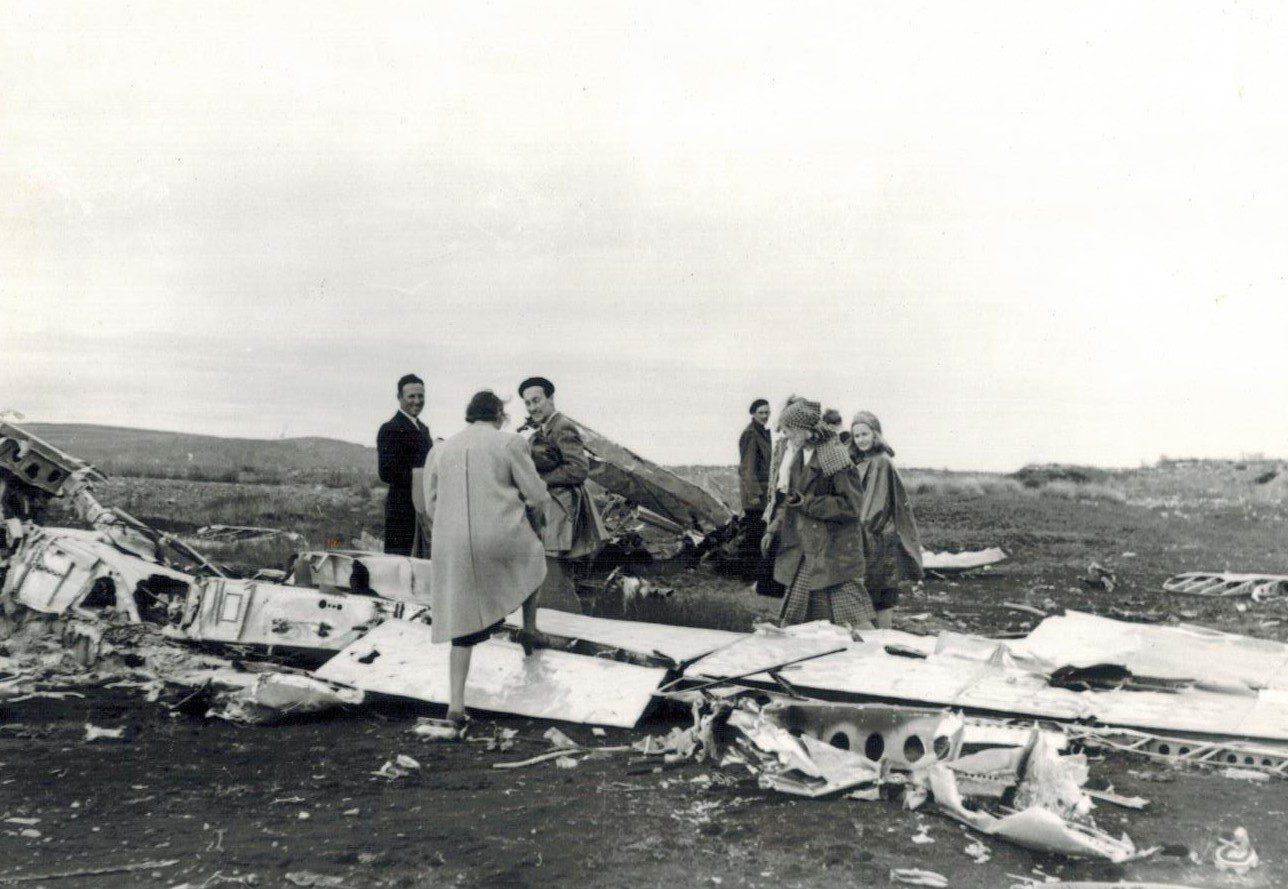 NEDSKUTT FLY: Arkitekter og gjenreisningsfolk studerer nedskutt russisk fly på Skagen sommeren 1945. Foto: Trond Danete