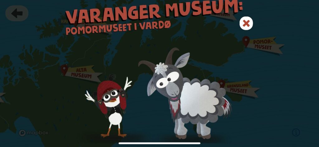 Appen er nedlastet på mobiltelefonen og det popper opp to gøyale tegneseriefigurer. Ei geit og fugl som babler i vei, på et språk og på en måte jeg hører vil fenge småbarn. De hopper, spretter og flyr rundt. Et kart kommer opp og jeg finner fram Pomormuseet.