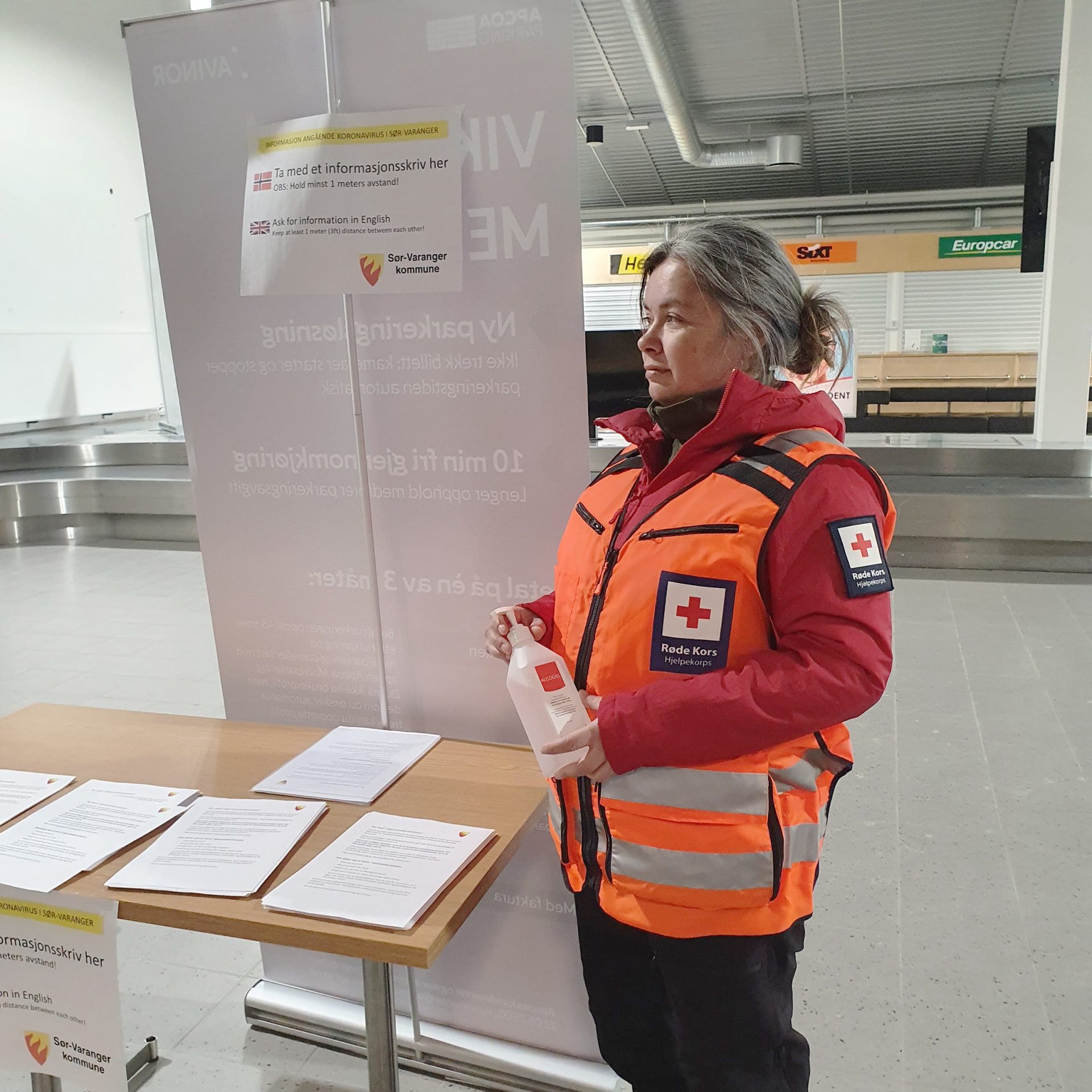Linda Christin Loe jobber nå frivillig for Røde Kors på flyplassen i Kirkenes. Der deler hun ut informasjon og ikke minst håndsprit til de få passasjerene som er ute og reiser i disse dager.