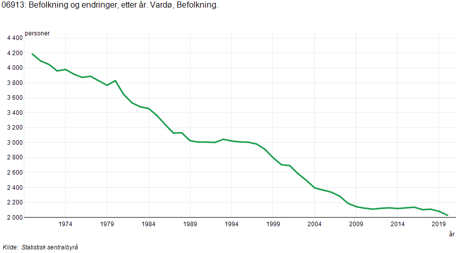 1970 var et toppår for Vardø med sine daværende 4187 innbyggere. Så begynte fallet. 10 år senere var vi nede i 3830 og i 1990 var det kun 3008 personer i kommunen. 10 år senere hadde vi mistet ytterligere 300 innbyggere og i 2010 var det registrert 2124 personer i Vardø kommune. I dag har vi falt under den neste grensen og har kun 1996 innbyggere igjen.
