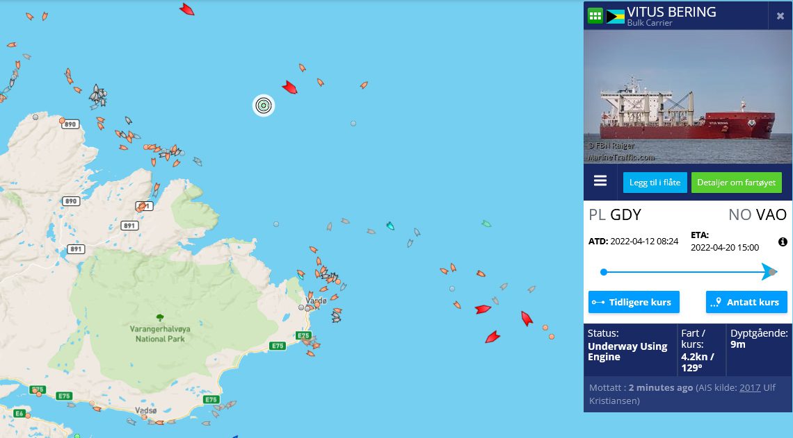 Det 250 meter lange skipet Vitus Bering er på vei til Murmansk, men vil stoppe utenfor Vardø i forbindelse med mannskapsbytte.