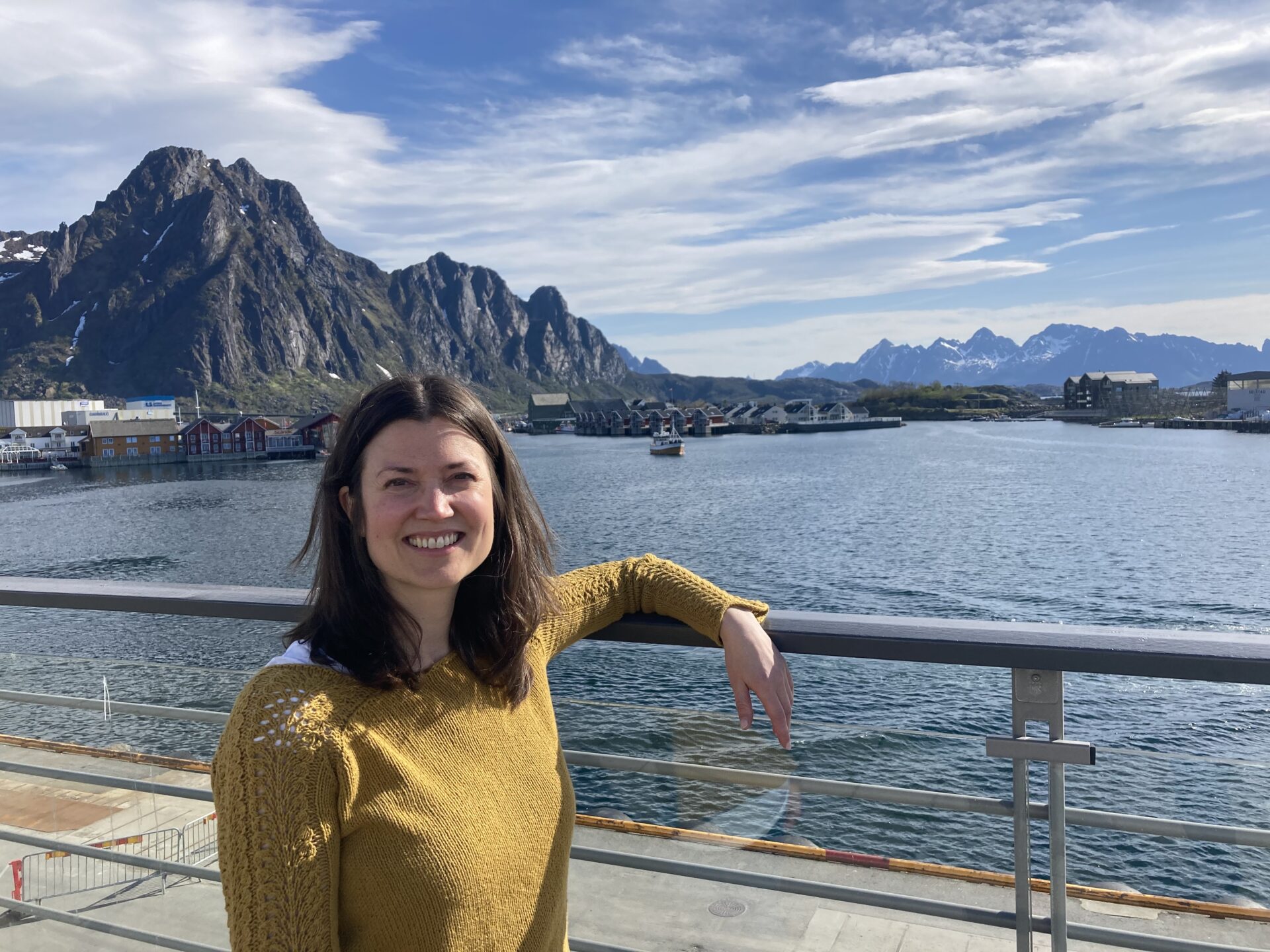 Forsker Guri Hjallen Eriksen nyter utsikten rett utenfor kontoret i Svolvær der mesteparten av avhandlingen hennes er skrevet. Foto: Snorre Sklet.