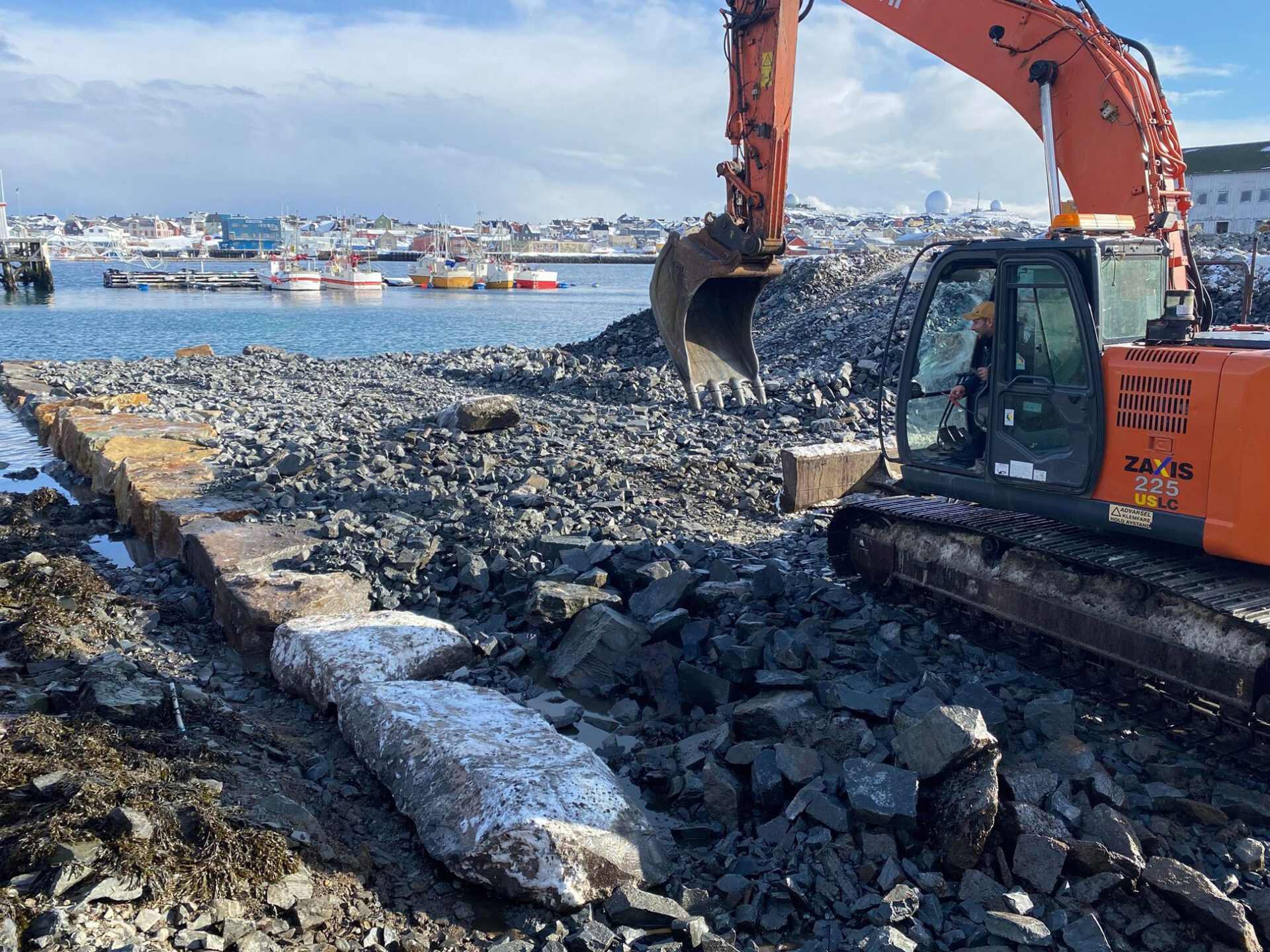Sjøentreprenøren AS er nå i full gang med siste del av sitt arbeid i Vestre Molokrok. Nå stables det store steiner som skal danne en støttemur mot den gamle, verneverdige moloen. Det er antatt at dette arbeidet vil ta omlag tre uker.