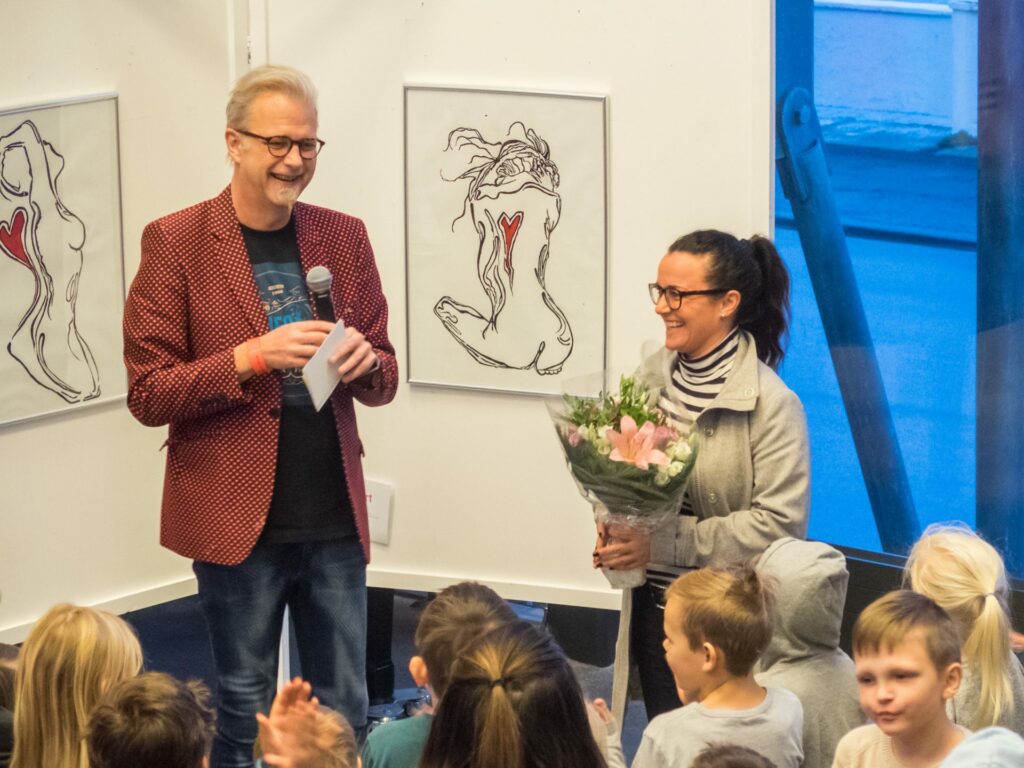 Utstillingen, og dermed også Blues i Vintermørket, ble åpnet av Steinar Kristiansen med noen velvalgte ord i Valhall onsdag formiddag. Og som vanlig ble det overrakt blomster til årets festivalkunstner.