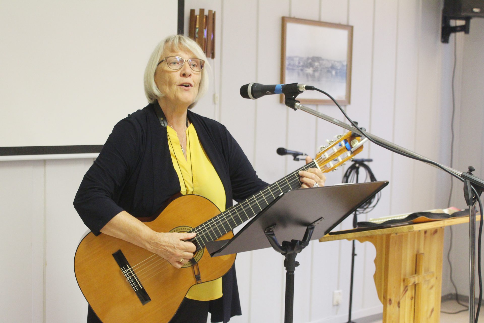 Det er vekkelsesmøte på Sjøkanten med sangevangelist Irene Krokeide Alnes fra Indremisjonsforbundet. Hun er invitert til møtet for å be, synge og spille på gitar gjennom nesten en hel uke med vekkelsesmøter hver kveld. Rundt 20 mennesker er samlet her denne mandagskvelden. På søndagskvelden hadde det vært 50 innom.