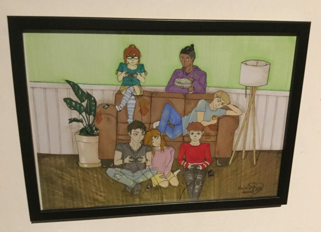 SAMFUNNSKRITIKK? Marion Bye gikk videre med tegningen «Når gjengen samles». Kanskje en kommentar til hvordan mange lever sine liv foran en skjerm selv når man møtes i virkeligheten, i stedet for å gi hverandre oppmerksomhet.
