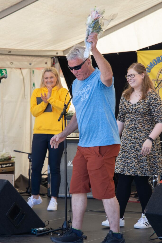 – Den som nå skal komme opp er en som alltid stiller oppstiller alltid opp med trekkspill og orkester på små og store anledninger. Han er også et selvsagt innslag på pomorfestivalen, nylig ble han også 75 år! Har dere ikke skjønt det til nå, ja det er Jakob Mikkelsen. Hvor lenge har du vært med?, spurte Nilssen. Alle 30 år? Gratulerer med dagen og jubileet!