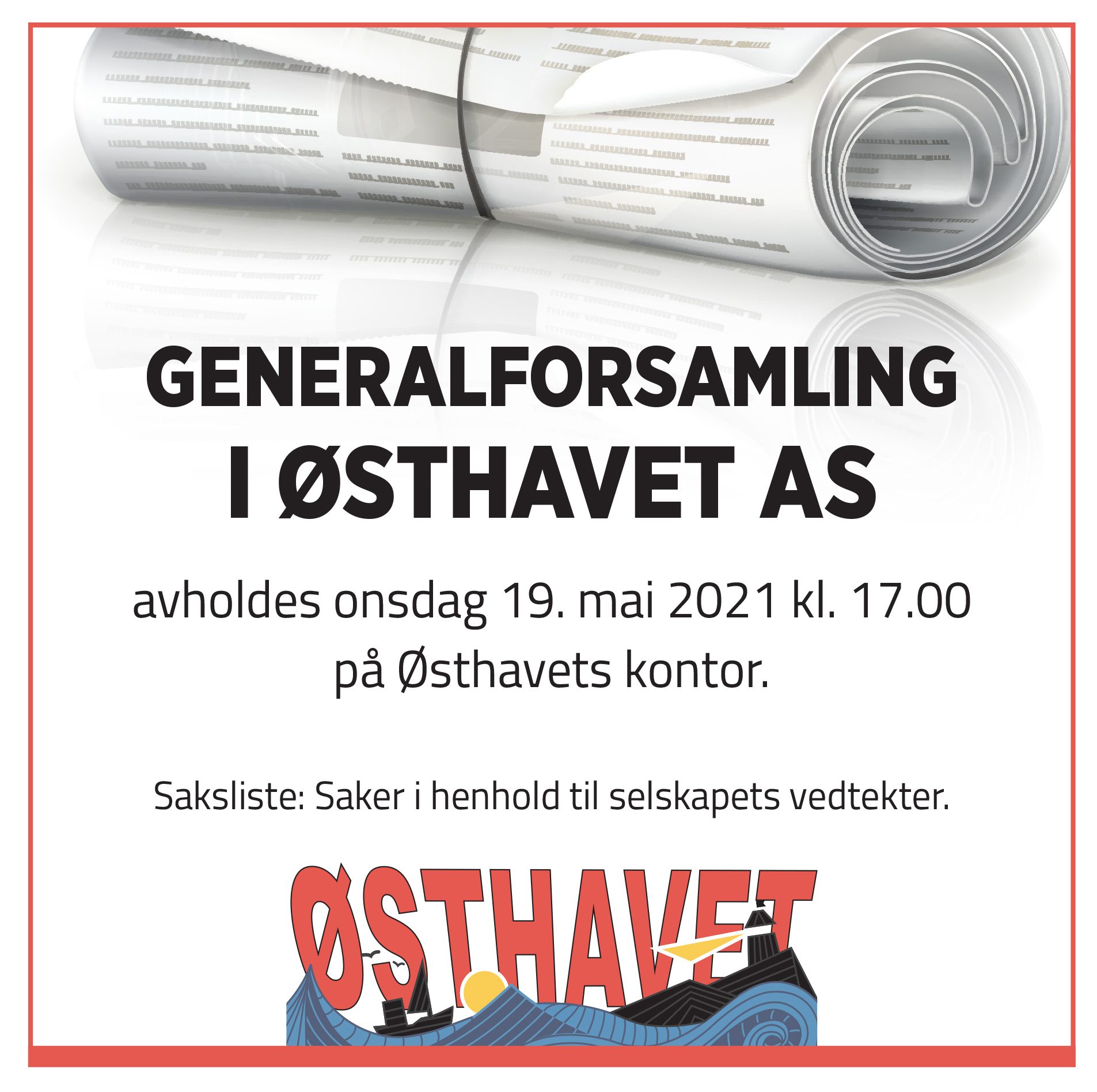 Generalforsamling i Østhavet As avholdes onsdag 19. mai 2021 kl. 17.00 på Østhavets kontor.