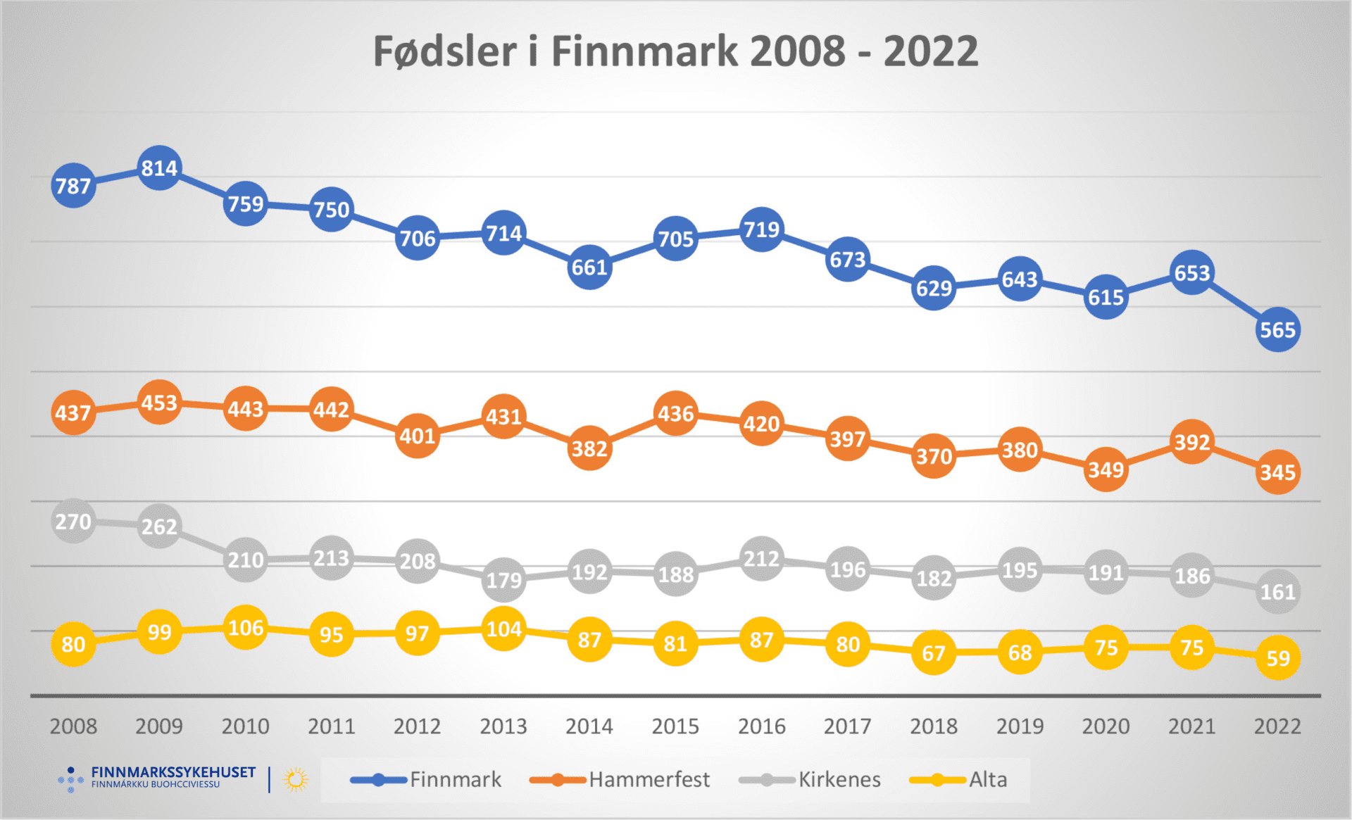 Tabellen under viser utviklingen i fødselstallet i Finnmark fra 2008 til og med 2022, og fordelingen mellom fødestedene. Selv om det var vært år med oppgang, viser kurven en nedadgående tendens.