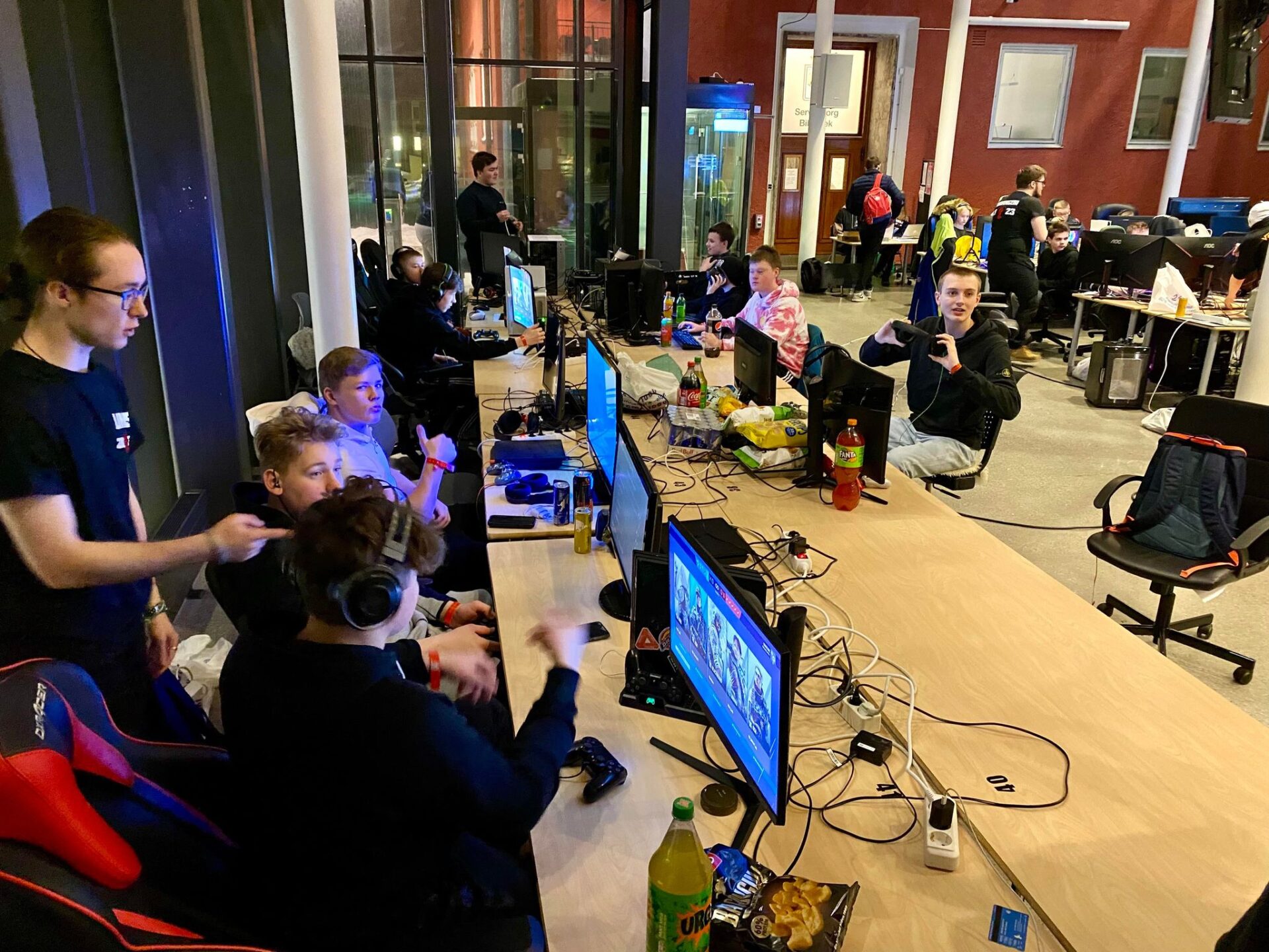 Alle deltakerne kom med eget datautstyr som skjermer, konsoller, joysticks og en haug med ledninger. Og selvfølgelig, veldig viktig, sin egen datastol. Kompiser fant plasser sammen, brukte noen timer på rigging, og før klokka hadde passert fem på ettermiddagen var de første i gang.