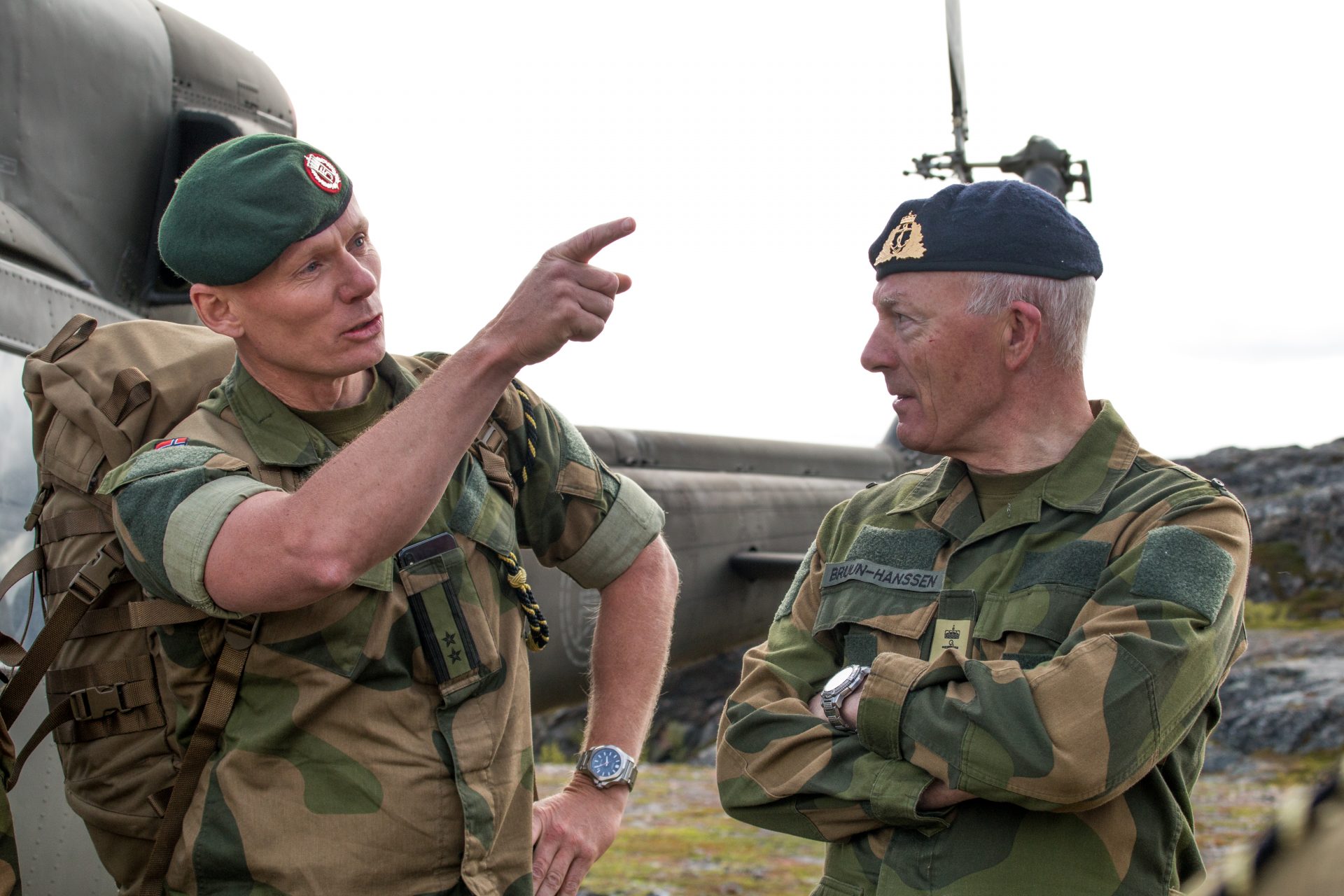 ØKNING I GRENSEVAKTENS KAPASITET: Forsvarsjef Haakon Bruun-Hanssen i samtale med den nye sjefen på GSV, Jan Marius Nilsen. I mai kunne Nilsen fortelle Bruun-Hanssen at han har sett en økning i Grensevaktens kapasitet etter satsingen på landmakten i Finnmark og utviklingen av Jegerkompaniet ved GSV. Foto: Mathias Sandstøl / Forsvaret
