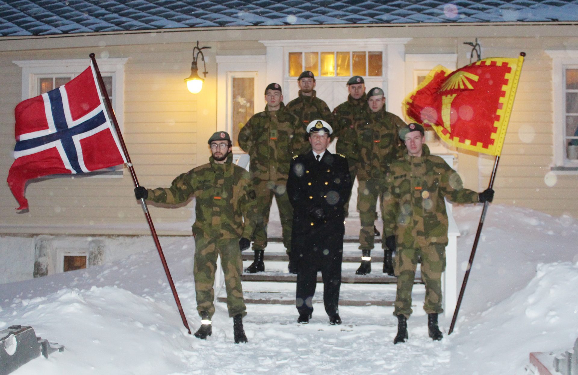 Avtroppende soldater Daniel Rajabpour og Lars Henrik Skallerud holdt flaggvakt under seremonien. De nye soldatene som nå skal tjenestegjøre på Vardøhus Festning i seks måneder er Sander Kvernmo, Kjetil Wik, Simon Steinkjellå og Kristoffer Væting ble stilt opp av kommandanten under en høytidelig seremoni.