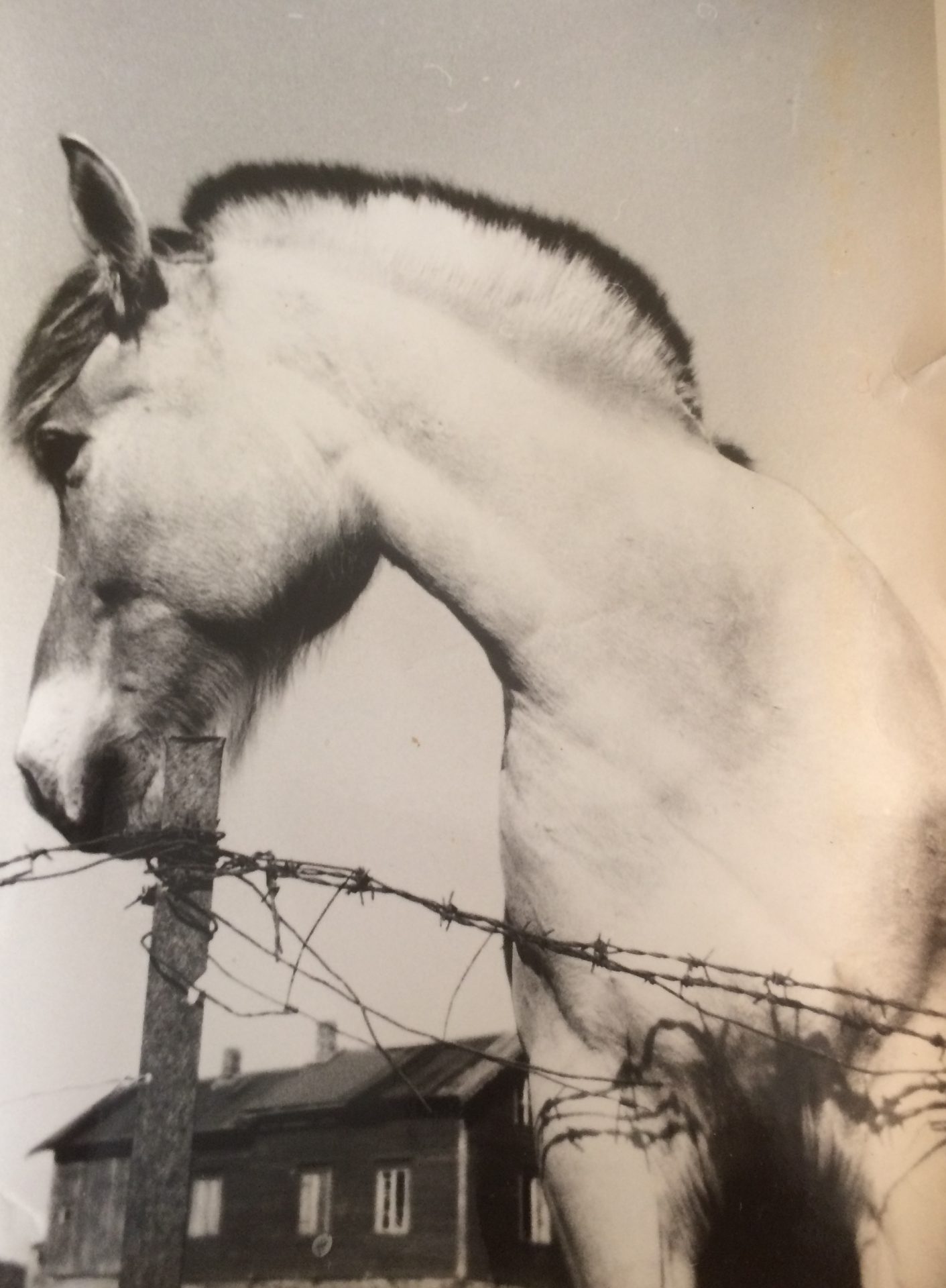 En søndag var vi på tur på Skagen og kom på hesten «Blakka» som var nysgjerrig på oss og kom til oss for å få klapp. Hun var inngjerdet med piggtråd og huset på bakgrunnen kunne kanskje være stallen, men det vet jeg ikke. Fotoet er tatt av Olav K. Andresen.