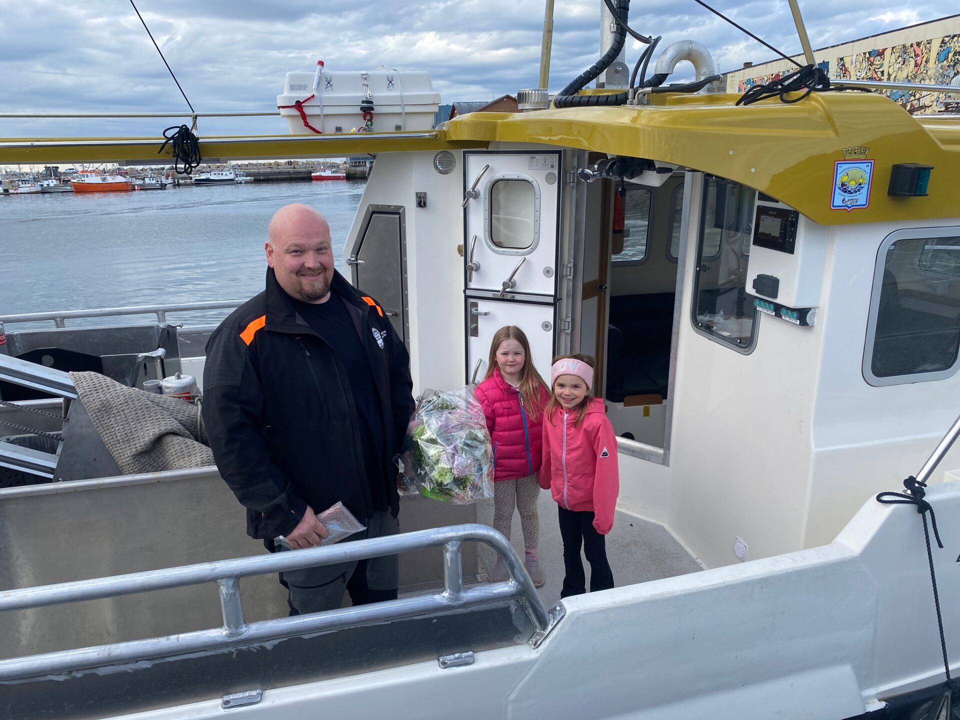 Ny båt. Frode Robertsen. Frode kom til Vardø på onsdag, med sin splitter nye Nor-Dan sjark, «Ronja Sofie». Frode ble tatt imot av familie, venner og kollegaer med fyrverkeri, kaker, kaffe, og god stemning blant 50-60 fremmøtte. «Ronja Sofie» er oppkalt etter Frodes datter, til venstre i bildet, som stolt viser fram den nye båten, sammen med sin venninne Pernille. Frode har nok å styre med både i sitt mekaniske verksted, der han sveiser, bygger og reparerer, og nå med ny båt. I tillegg har Frode og to fiskerkollegaer stiftet nytt selskap, der de sammen skal fiske med Frodes gamle båt. Flott med nye fartøy til kommunen, og utrolig sprek satsing som vi setter stor pris på. Vi gratulerer og ønsker lykke til videre.
