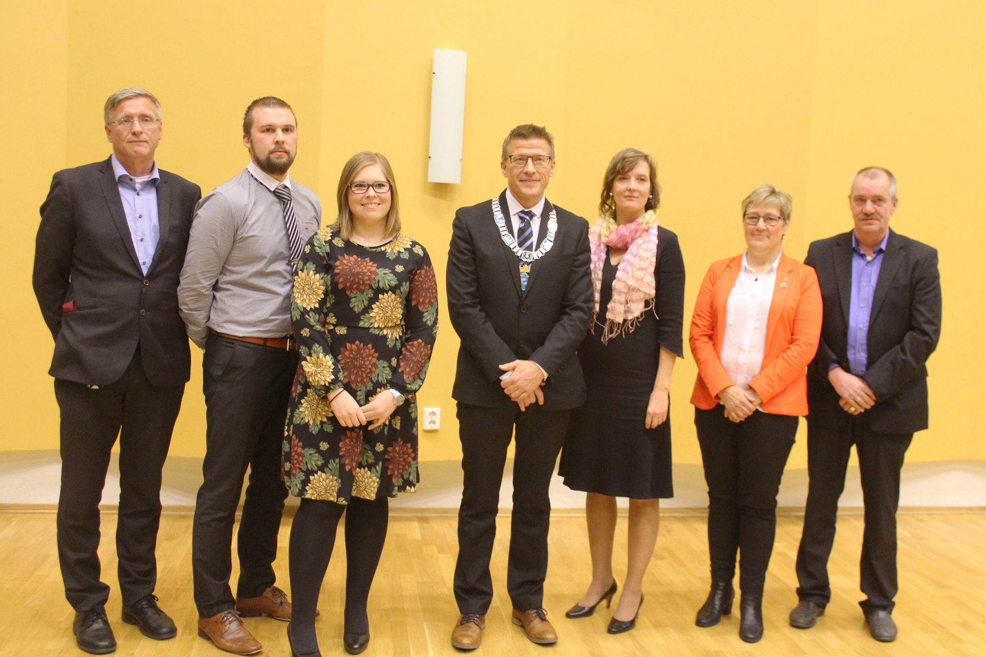 FORMANNSKAPET 2019-2023: Robert Jensen (Ap), Nicklas Malin (Ap), Christine Nilssen (H), Ørjan Jensen (Mdg), Maria Bertheussen Skrydstrup (Mdg), Catrine Rosanoff Aronsen (Ap) og Morten Wilhelmsen (SV). Wilhelmsen er første vara til formannskapet. Terje Soløy (Sp) er valgt som fast representant, men han var ikke tilstede på det konstituerende bystyret. Foto: Magne Henriksen