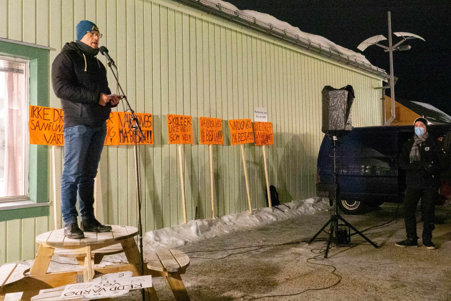 – Kjære studenter, kjære ansatte og lærere, kjære vardøværinger! Det e nu det gjeld. Nu brenn det virkelig på dass. Det er altså foreslått uforståelige og uakseptable kutt i skoletilbudet. Slik startet ordfører Ørjan Jensen sin appell.