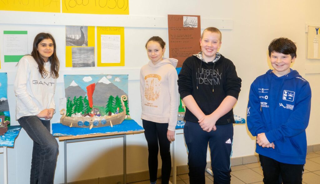 – Vi har jobbet med dette i ca. tre uker. Det har vært fint og morsomt å jobbe med vikingetiden, men vi har hatt litt diskusjoner underveis, forteller Sara Kjeldsen Vasshaug, Ingrid Thorsen og Benjamin Sivertsen.