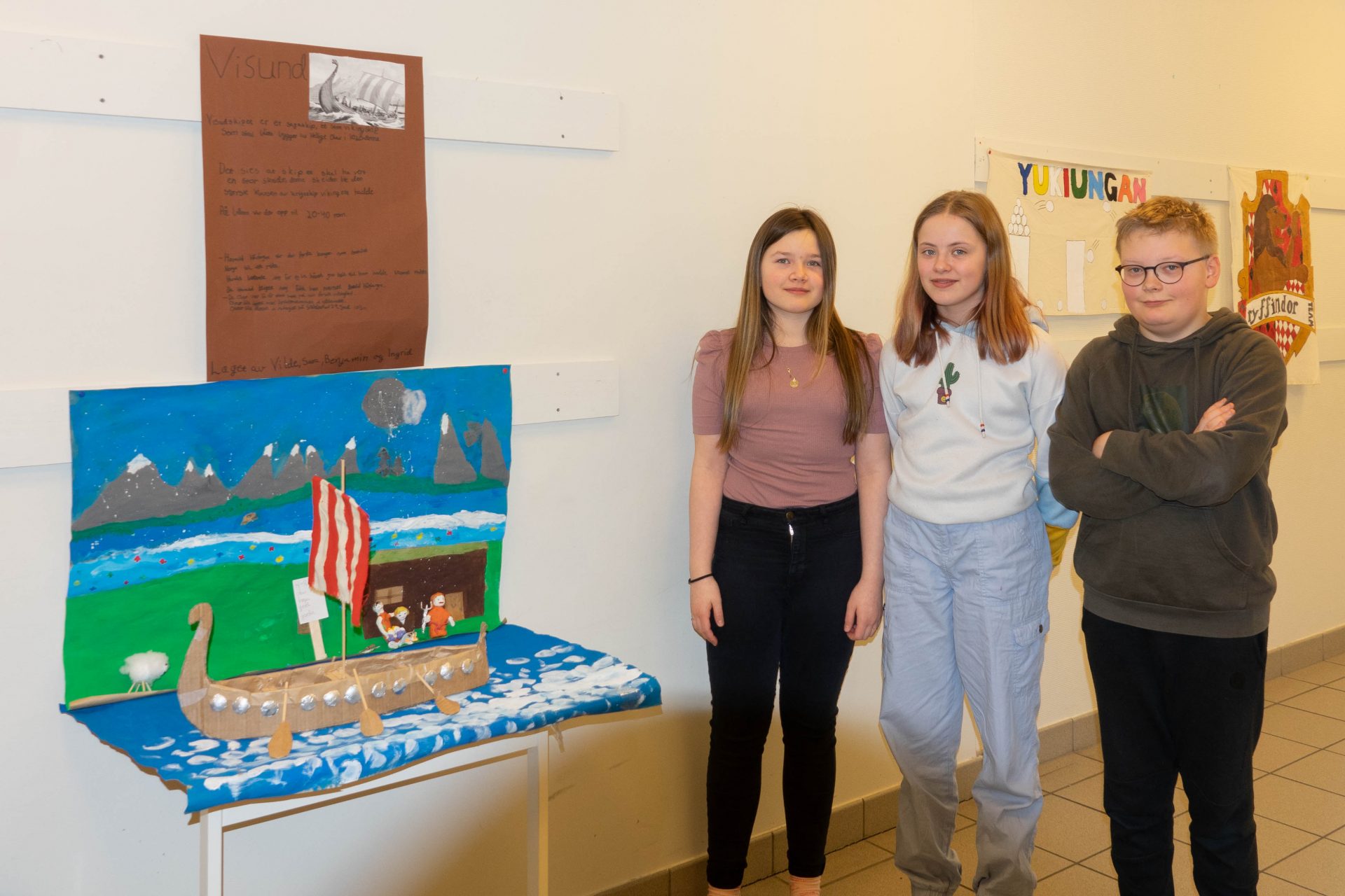 – Vi har jobbet med dette i ca. tre uker. Det har vært fint og morsomt å jobbe med vikingetiden, men vi har hatt litt diskusjoner underveis, forteller Sara Kjeldsen Vasshaug, Ingrid Thorsen og Benjamin Sivertsen.