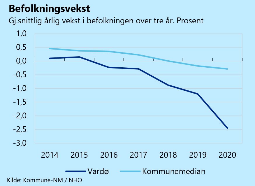 Vardø kommune ligger i bunnsjiktet på flere områder. Det mest alvorlige er kanskje den velkjente fraflyttingen, hvor vi på «befolkningsvekst» ligger så godt som bunn både i fylket og landet for øvrig, med henholdsvis 37.plass og 349-plass (av 39 og 356). og kurven peker bratt nedover.