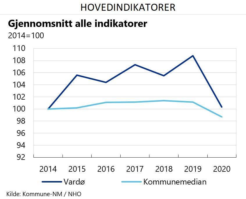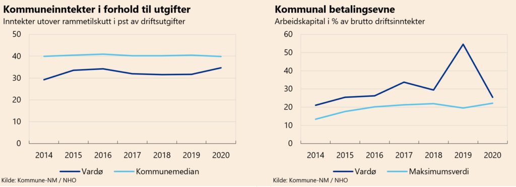 For kommuneøkonomien får vi en 10.plass i fylket og en 172.plass i landet. Likevel peker kurven i feil retning. Kommunale administrasjonsutgifter vil si netto driftsutgifter til administrasjon per innbygger, i 2019-kroner, hvor tallgrunnlaget er fra 2020. På dette området ligger Vardø på en 8.plass i fylket og en 195.plass i landet. Likevel, kurven tilsier økende utgifter. Når det gjelder kommunal betalingsevne, altså arbeidskapital i prosent av brutto driftsinntekter, gir det Vardø en 11.plass i fylket og en 123.plass i landet.