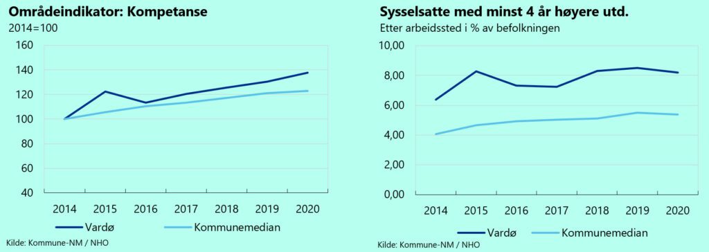 Når det gjelder kompetanse så er Vardø på en 15.plass i fylket, men klarer ikke mer enn en 270.plass på landsbasis. Kurven peker oppover. Ser man kun på andel sysselsatte med minst fire års høyere utdanning, så ligger vi godt an på en 8.plass i fylket og en 62. plass i landet. Likevel skal man være klar over at her har kurven begynt å peke svakt nedover.