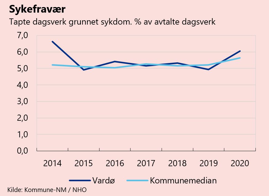 Vardø er også god på antall uføre. Her ligger man på en 10.plass i fylket og 153.plass i landet, og kurven peker i rett retning. Samtidig bør man være klar over at kurven for sykefravær peker oppover.