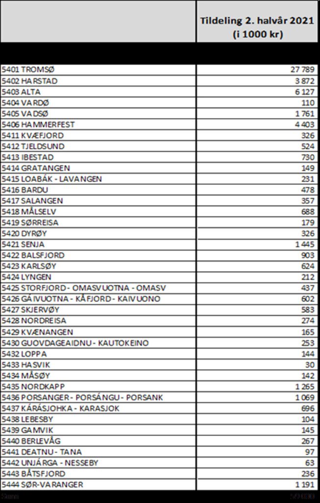 – Mens enkelte kommuner i fylket hadde store smitteutbrudd i første halvår, ser vi nå at alle kommunene har hatt utbrudd i større eller mindre grad. Vi har derfor valgt å fordele pengene andre halvår på en måte som tar hensyn til alle kommunene, skriver Statsforvalteren i Troms og Finnmark.