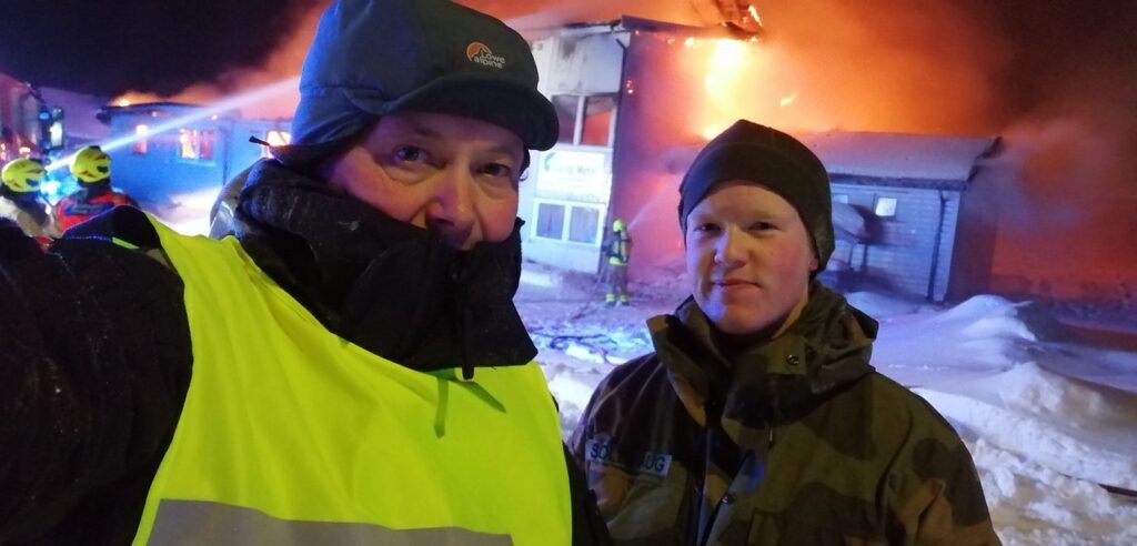 – Det var gigantiske gnister, og det var fint å kunne hjelpe til, slik at brannfolka kunne fokusere på brannen. Etter hvert kunne vi trekke tilbake til brannen, og dro til festningen og henta ytterligere flere slanger. Etter hvert deltok vi også med å spyle i et par timer før det var ganske god kontroll på brannen, sier soldaten og forteller at det var fint at de nylig har gjennomført branndrill.