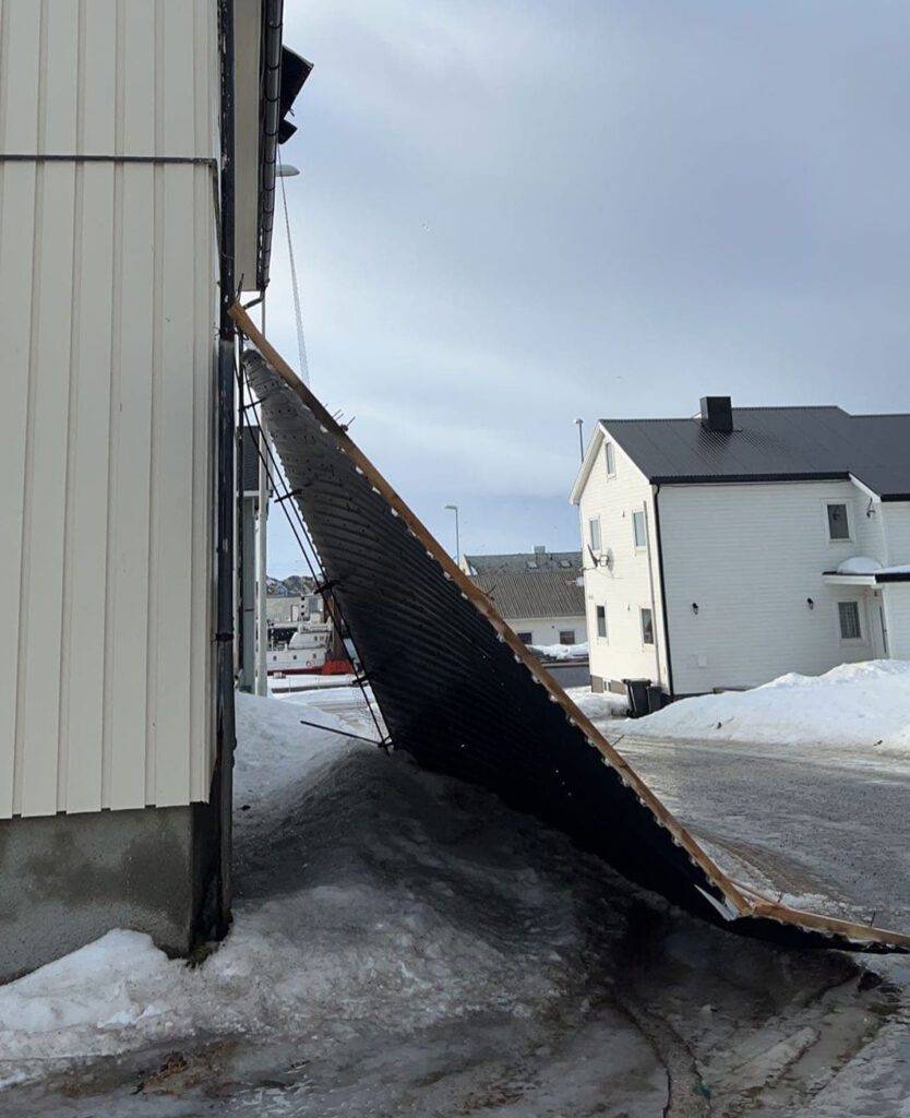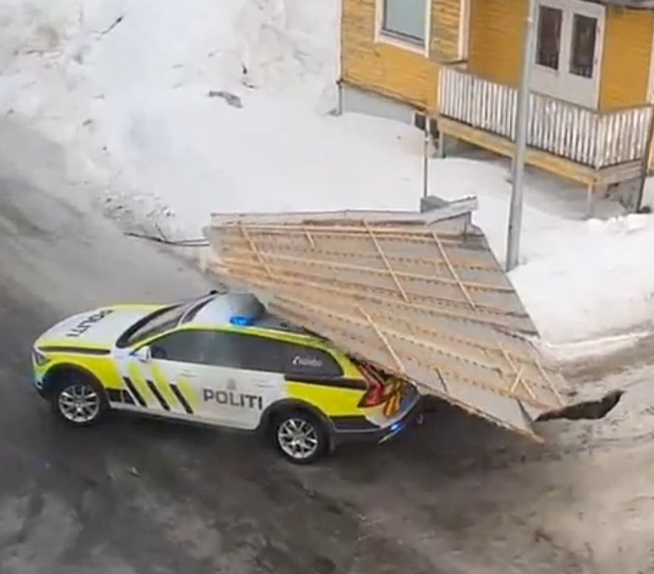 Lørdag formiddag skapte uværet mer trøbbel enn normalt da et halvt hustak tok seg en flytur i nabolaget. Som om ikke det var nok, landet taket på en politibil.
