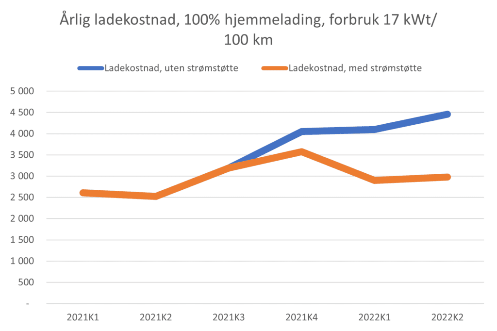 Kostnadsøkningen for elbilistene er imidlertid beskjeden. Selv om prisen på å lade hjemme i snitt har økt med 1937 kroner fra juni 2021 til juni 2022 tar staten en stor del av regningen. Dersom du bare lader hjemme, gjør strømstøtten at økningen kun blir på 460 kroner per år.