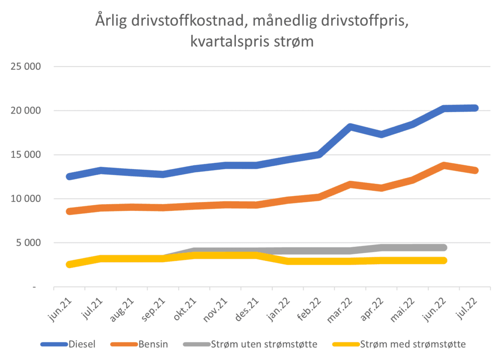 – Staten dekker nå to av tre kroner i økte ladeutgifter for elbilister som lader hjemme. Samtidig har prisene på bensin og diesel økt med henholdsvis 48 og 53 prosent fra juli i fjor til juli i år. Om prisene fra i sommer holder seg vil det koste 20 000 kroner i drivstoff i året for en dieselbilist, mens tilsvarende årlig utgift for en elbilist er 3 000 kroner, inkludert strømstøtten, sier hun.