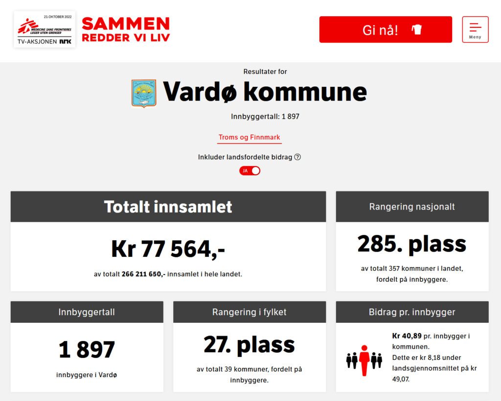 Selv om det ble et relativt lavt resultat i år, så var det en solid økning sammenliknet med 2021 da vardøværingene kun ga 30 kroner i gjennomsnitt. I 2020 endte gjennomsnittet i Vardø på 36 kroner og i 2019 ga man kun 31 kroner.