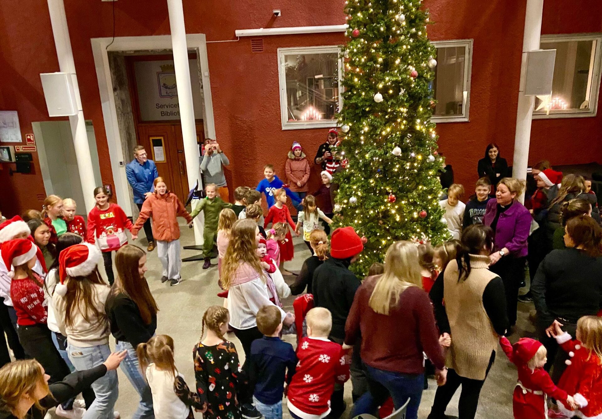 Prest Berit Kristin Klevmoen leste juleevangeliet på en lettfattelig måte før bymusikken, med nisseluer, spilte julesanger mens barn og voksne gikk rundt juletreet på tradisjonsrikt vis. Og selvfølgelig kom julenissen med noe godt i sekken til alle små. En sosial og koselig juletradisjon som gir oss alle den gode julestemningen.