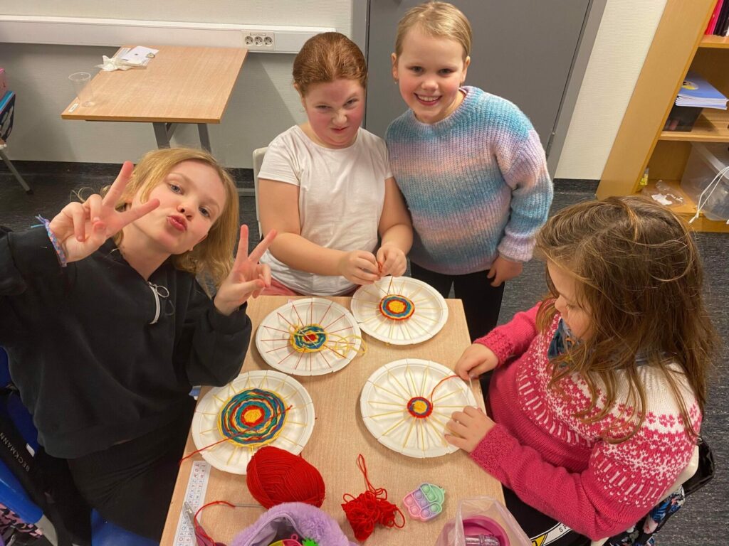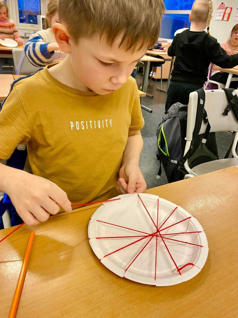 Merethe Pettersen, kontaktlærer på tredje trinn, forteller at de jobber med produkter som skal brukes og fremvises i forbindelse med Samefolkets dag 6. februar. Hovedfargene som brukes er blå, rød, grønn og gul, samefolket farger, som også går igjen i sameflagget.