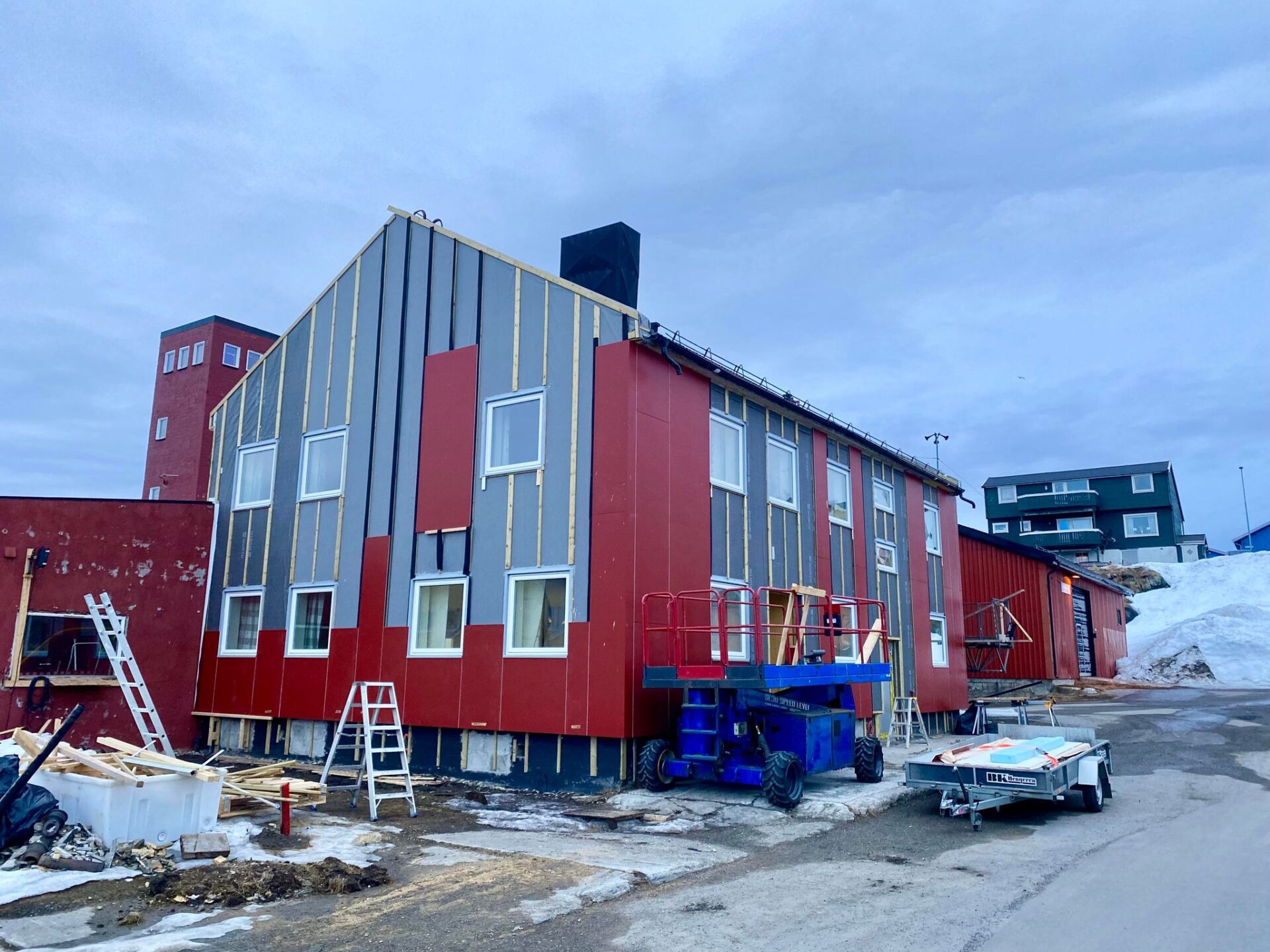 Hele bygget vil til slutt være kledd i den samme mørkerøde fargen som Vardø skole og rådhuset.