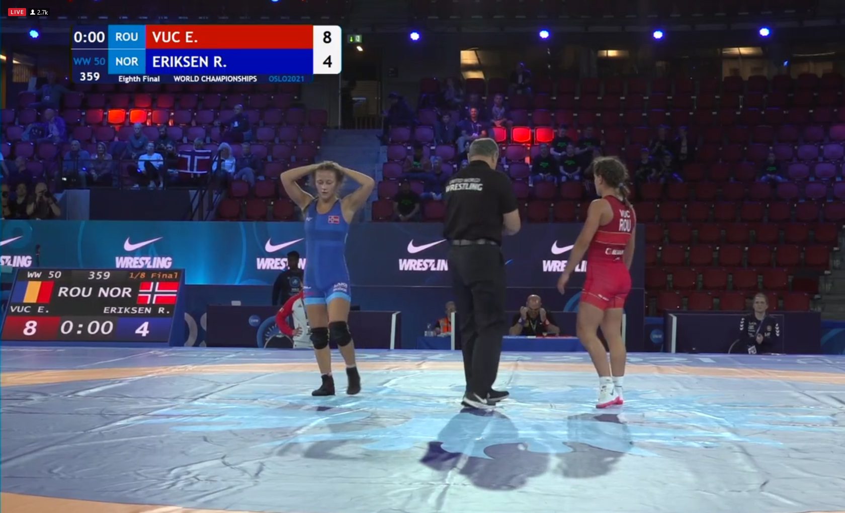 Åttendedelsfinalen i 50-kilosklassen mellom Emilia Alina Vuc frå Romania og vår egen Ramona Eriksen endte 8 – 4 til Vuc. Selv om det ble tap, kom Eriksen sterkere mot slutten og gjorde en god kamp. Likevel er ikke VM helt over.