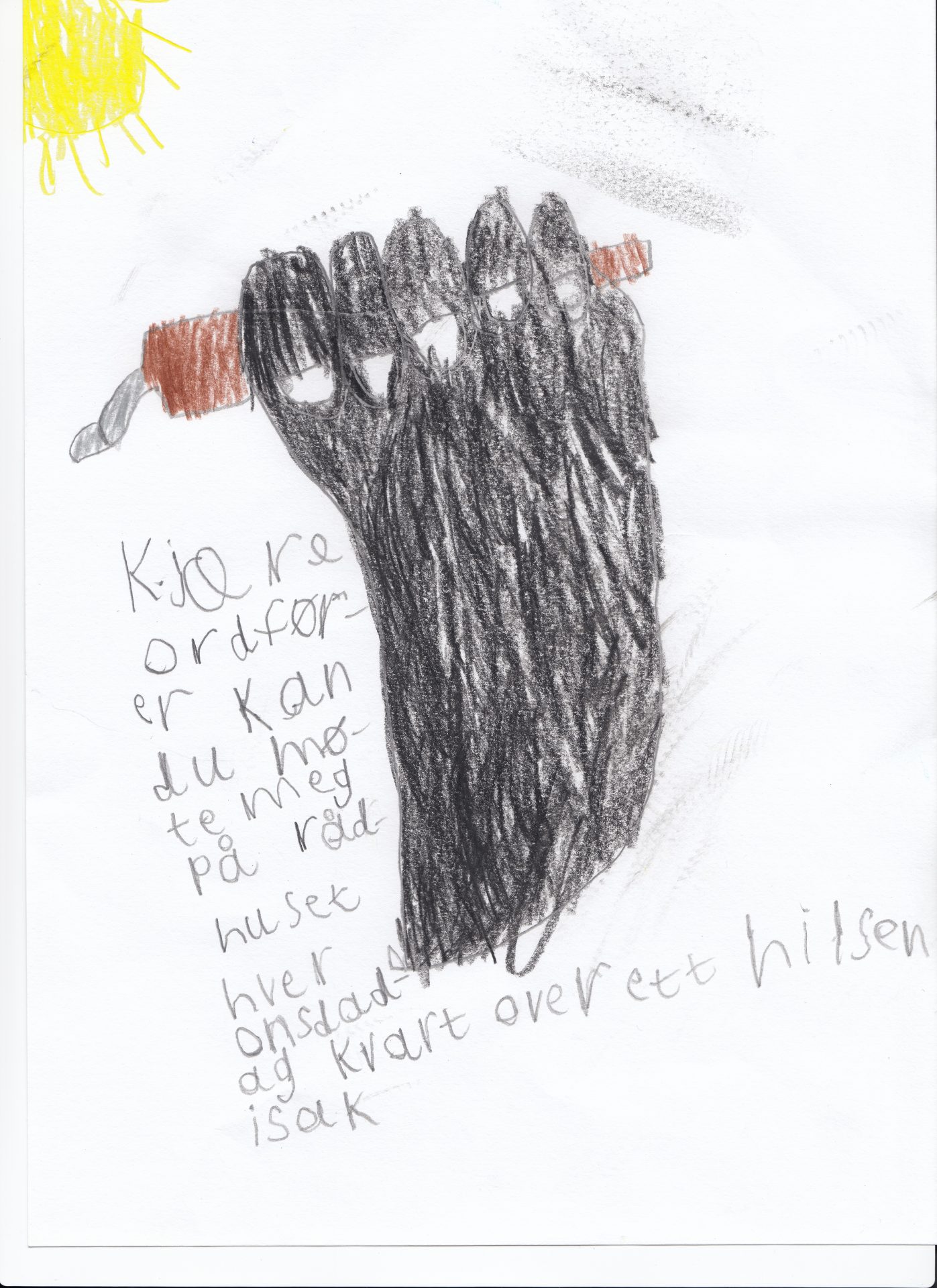 For et par uker inviterte Østhavet 2. klasse ved Vardø skole til å sende oss tegninger og hilsener i forbindelse med at sola er tilbake. Isak Mathisen Pedersen hadde på sin flotte tegning en hilsen til ordføreren i Vardø, der det sto følgende: