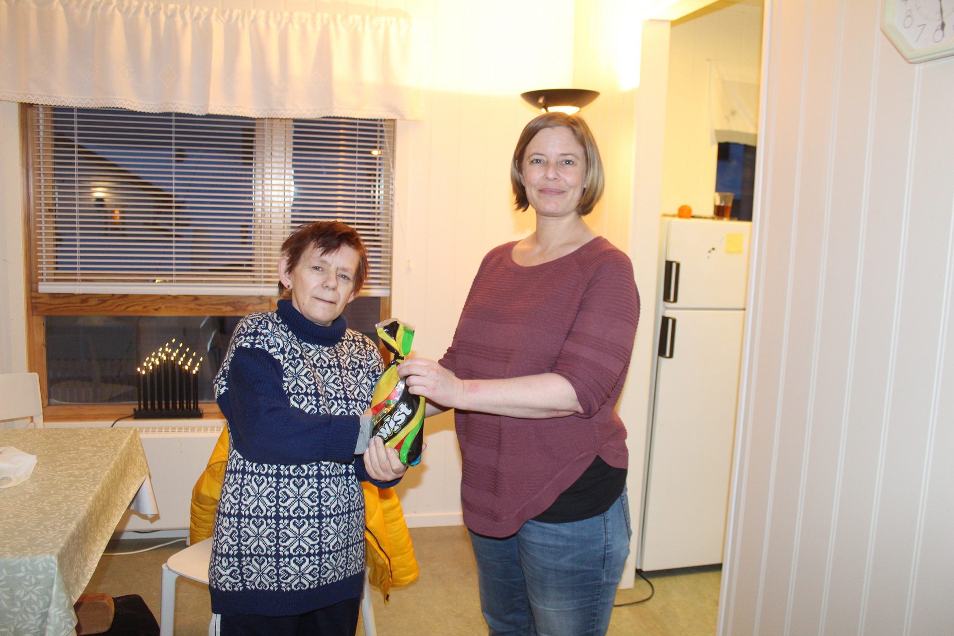 GJØR EN GOD JOBB: Gunn Aasen sier at de ansatte i «Vadsøgata» gjør en god jobb, og hun ville gjerne gi de en pose Twist for å takke dem for at de utgjør en forskjell i lokalsamfunnet. På vegne av de ansatte er det Pia Bertheussen som tar imot heder. Begge foto: Magne Henriksen