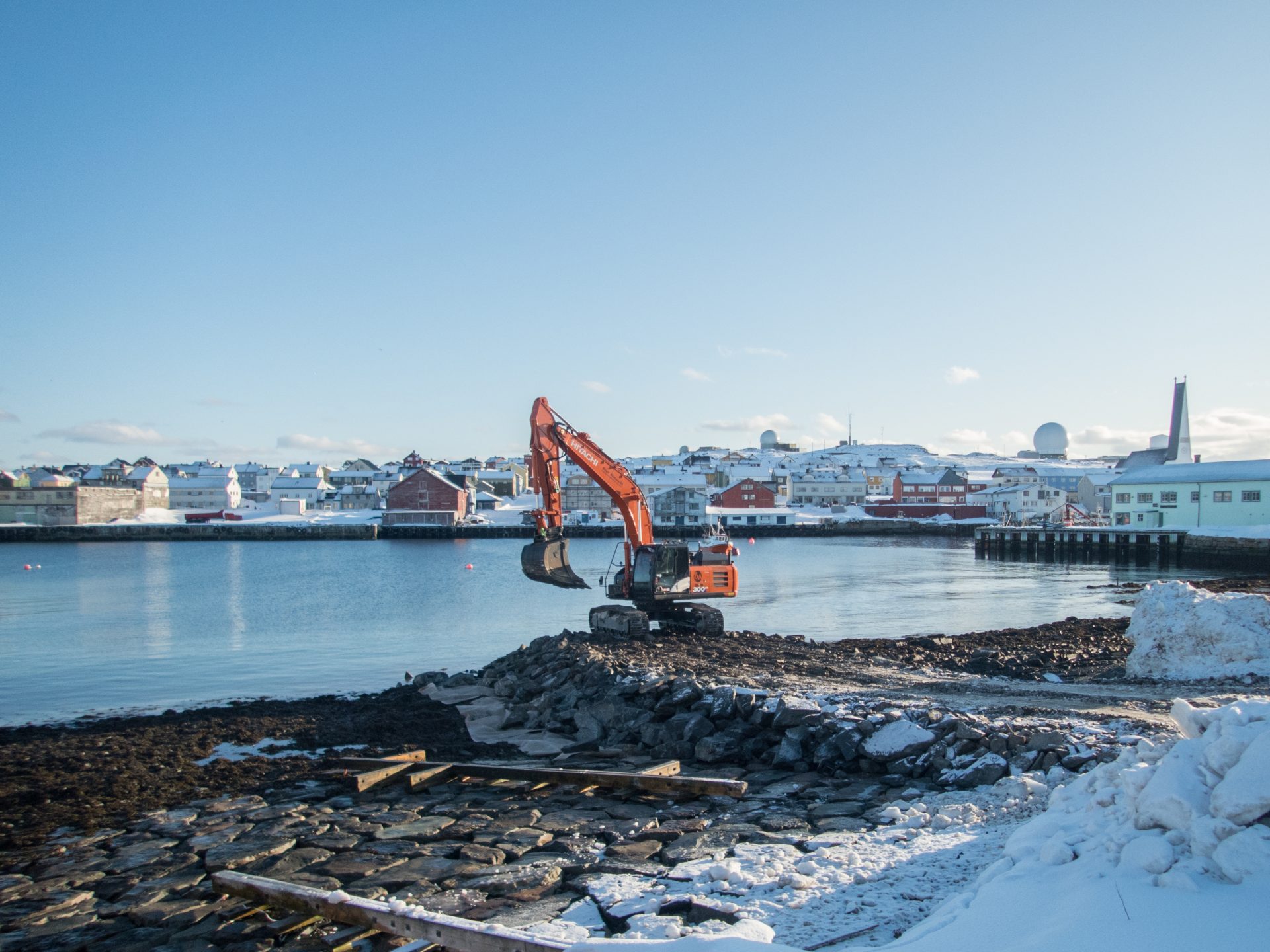 Arbeidet med indre molo er i gang. Bildet viser status onsdag morgen denne uken.