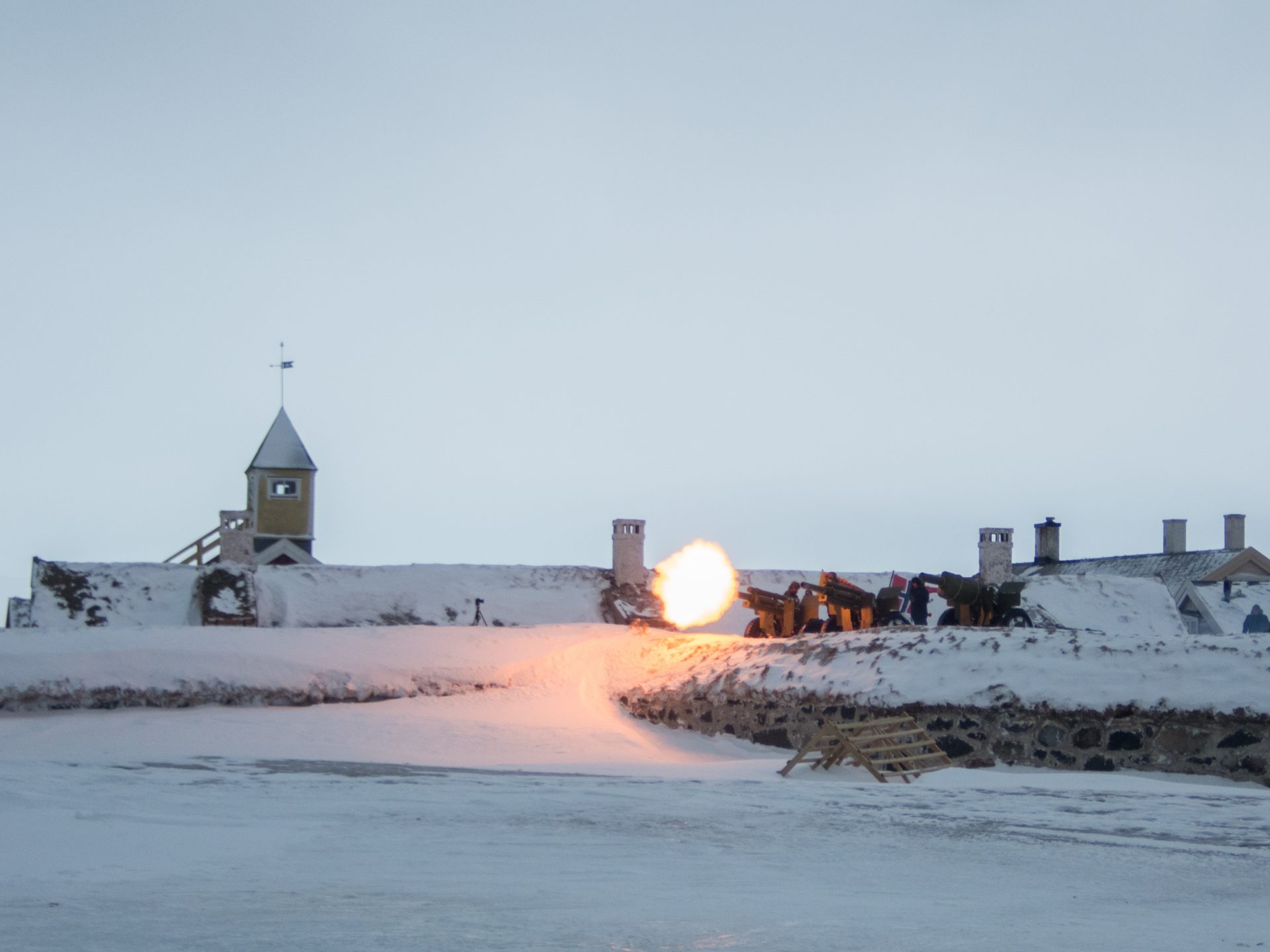 Kaldt og vindfullt, men ingen kongebursdag uten salutt fra Vardøhus festning. 21. februar dundret kanonene på stjerna i stiv sørvest kuling.