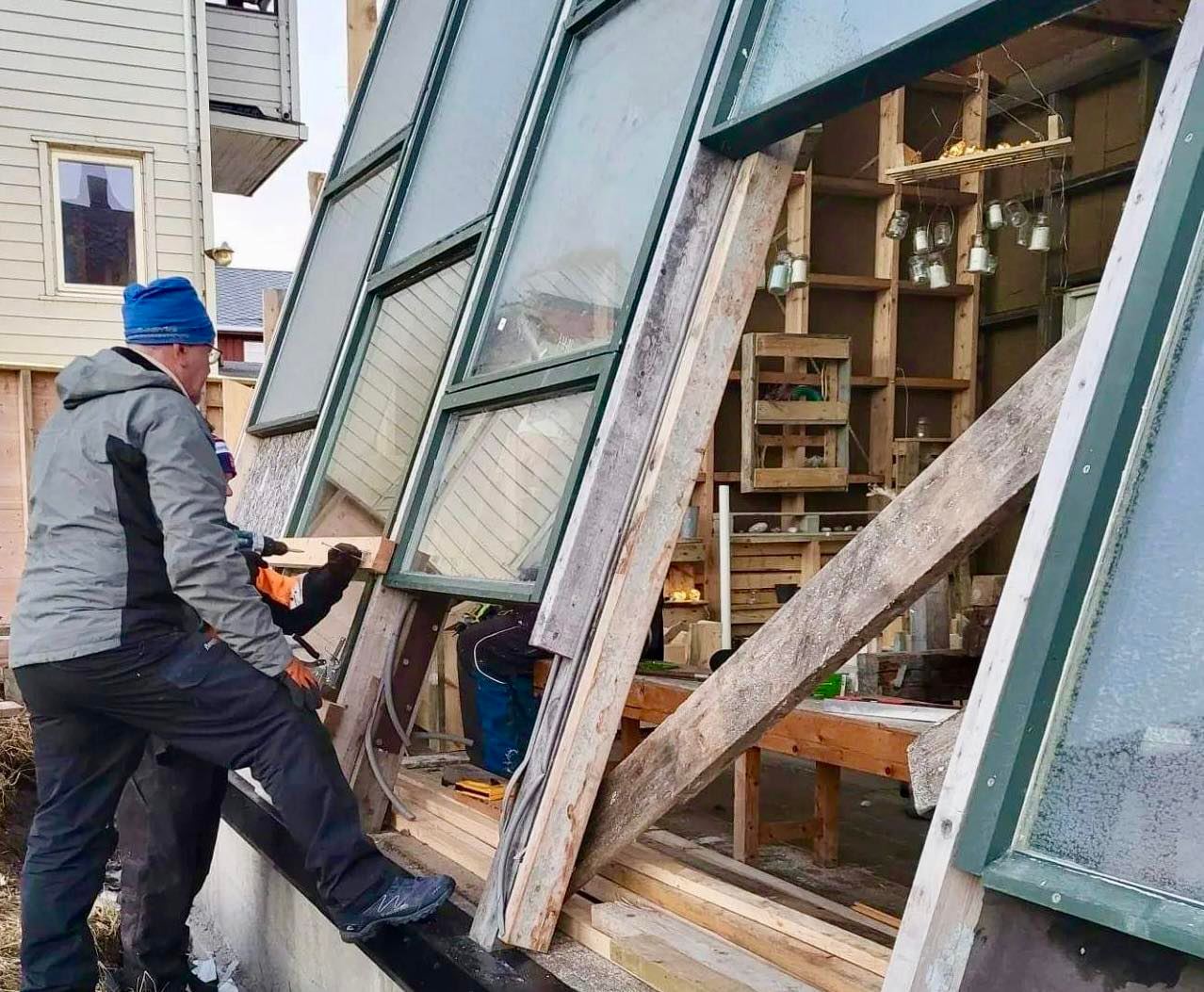 Sist lørdag var flere i den frivillige dugnadsgjengen på plass igjen på Dyrk Varangers drivhus. Steg for steg blir vindusfasaden mot sør ferdig.